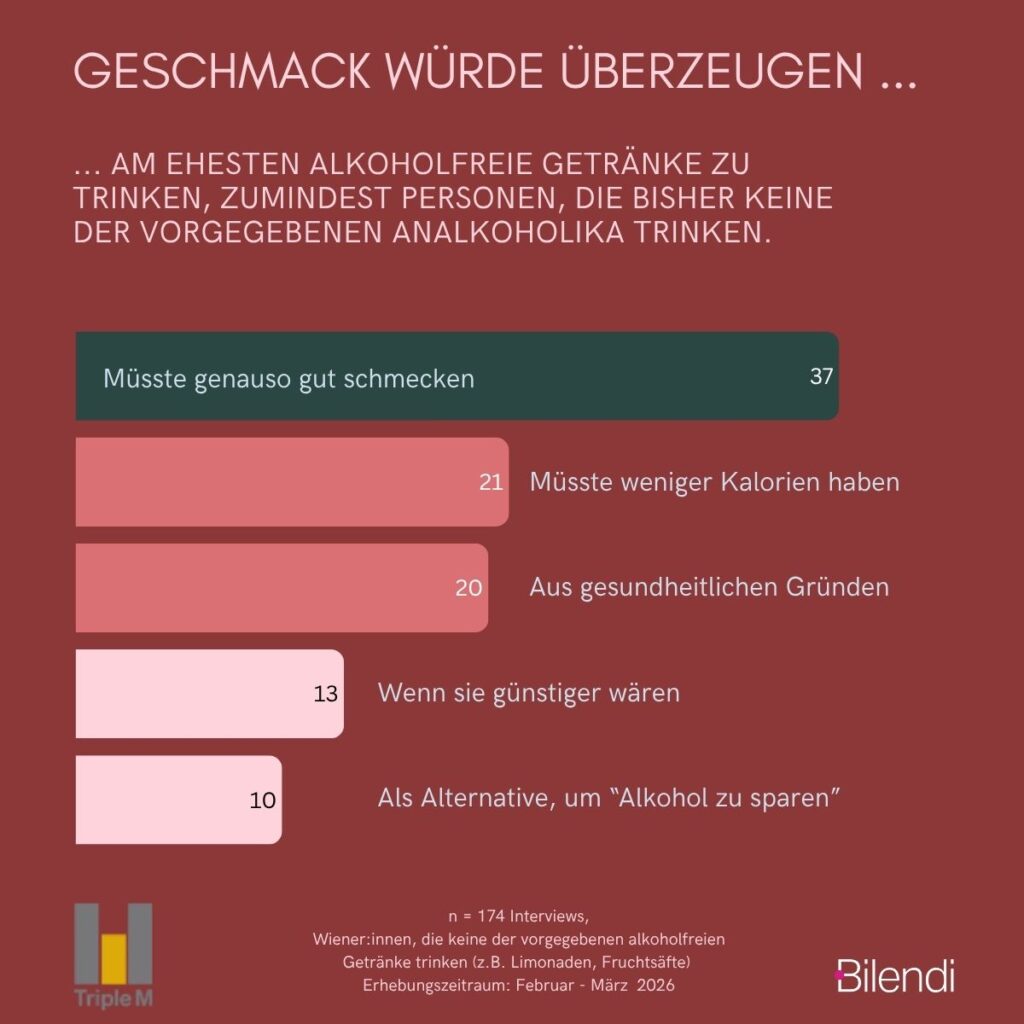 Der Geschmack ist auch das beste Argument, um Personen, die keine der vorgegebenen Analkoholika konsumieren, davon zu überzeugen. An zweiter Stelle stehen wiederum gesundheitliche Aspekte, wobei hier das mögliche Motiv „weniger Kalorien“ am häufigsten genannt wird. Der Preis spielt hingegen eine eher untergeordnete Rolle.