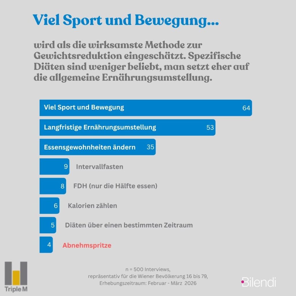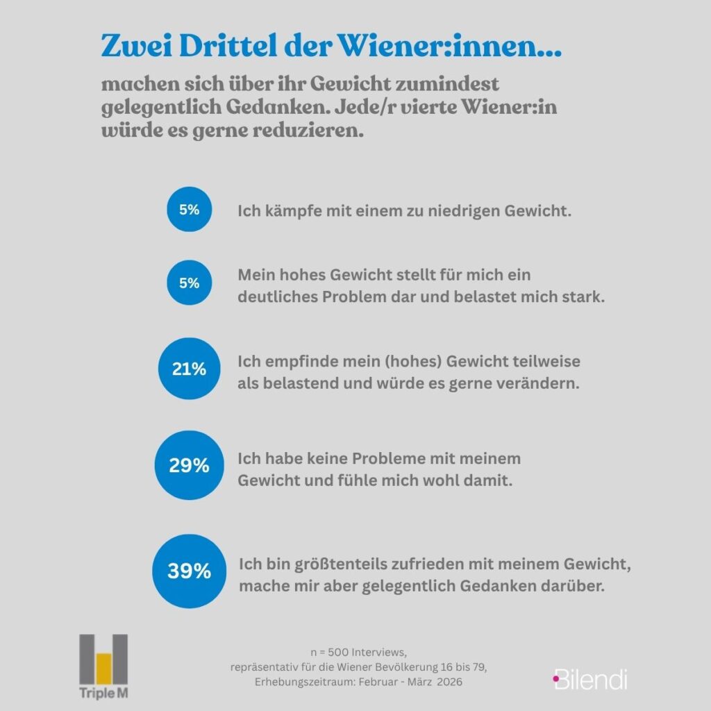 Abnehmen gehört zu den großen Herausforderungen unserer Wohlstandsgesellschaft. Dafür sorgen nicht zuletzt Social Media, die vor allem das Selbstbild von Mädchen und jungen Frauen beeinflussen. Die große Mehrheit der Wiener:innen ist mit ihrem Gewicht zufrieden, ein Viertel will abnehmen, mehr als ein Drittel hat dies schon erfolgreich getan. Sport und Ernährung gelten als Schlüssel dazu, nur 4 % würden auf die Abnehmspritze setzen. In einer Studie für den ORF Wien und mit Unterstützung unseres Feldpartners Bilendi sind wir diesen Fragen auf den Grund gegangen.