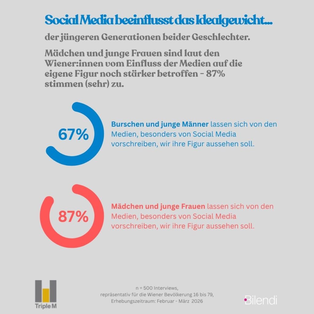 Wohl wenig überraschend spielen Social Media eine wesentliche Rolle für dieses Thema, zumindest sehen es die Wiener:innen so. 87 % meinen, dass Social Media Mädchen und jungen Frauen vorgeben, wie ihre Figur zu sein hat. Bei Burschen und jungen Männer sind es immerhin auch 67 %, aber der vermutete gesellschaftliche Druck ist doch deutlich geringer.
