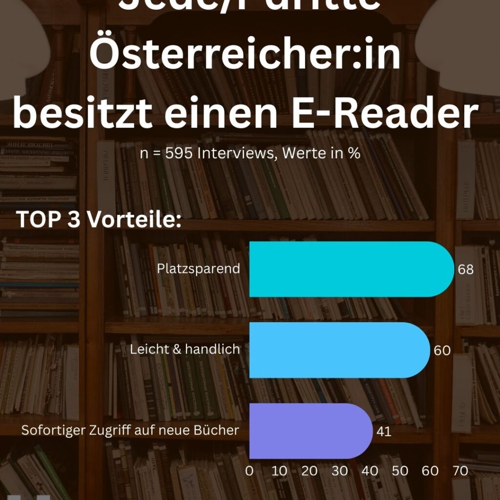 Die Digitalisierung macht auch nicht vor dem Lesen von Büchern halt: 35 Prozent der Österreicher:innen besitzen einen E-Reader. 68 Prozent von ihnen schätzen, dass E-Reader platzsparend sind und sehen darin quasi eine persönliche Bibliothek im Taschenformat. 60 Prozent halten die Geräte für leicht und handlich. 41 Prozent sind von dem sofortigen Zugriff auf neue Bücher angetan.