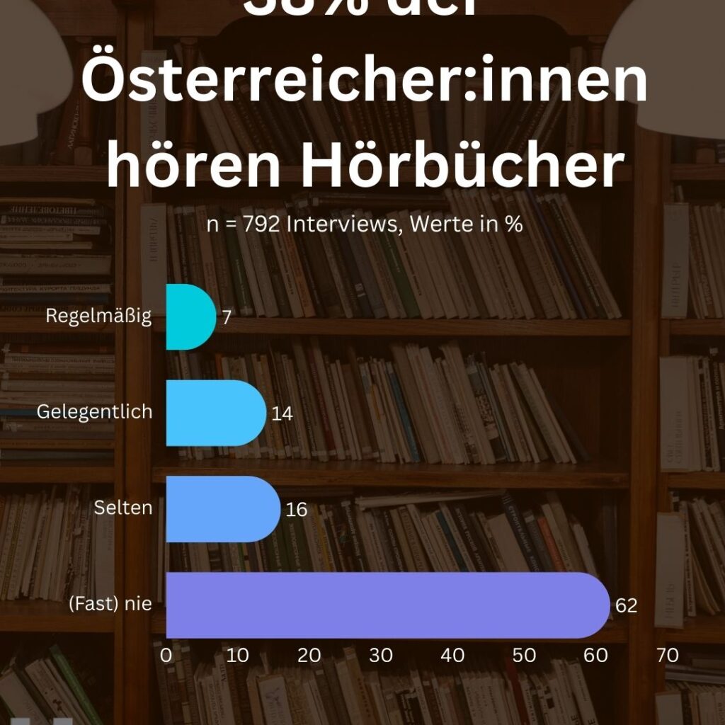 Literatur ist nicht nur zum Lesen da. Hörbücher erscheinen aktuell als starker Trend. Immer mehr Freunde und Bekannte erzählen, dies und jenes im Auto, in der Bahn oder beim Sport gehört zu haben. Wie stark ist der Trend wirklich? 38 Prozent der Östereicher:innen hören zumindest gelegentlich Hörbücher, wobei der harte Kern eine Nische von 7 Prozent ist. Zu betonen ist, dass die Frage dezidiert auf „Hörbücher“ abzielte und nicht auf Podcasts, die vermutlich eine deutlich höhere Verbreitung haben.